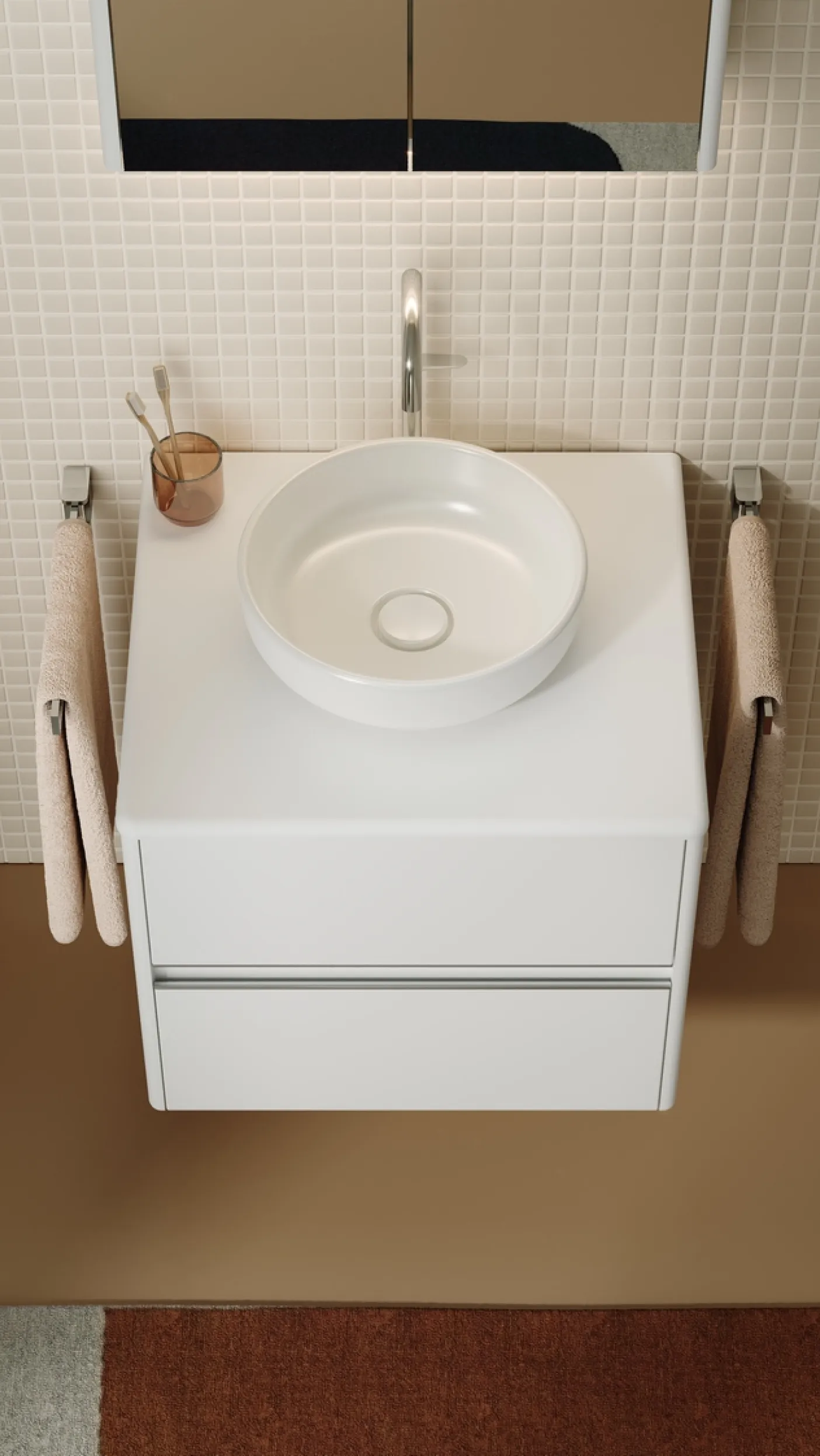 Oteo wurde gezielt auch für kleinere Räume entwickelt und entfaltet gerade dort seine Wirkung. Die Serie bietet eine durchdachte Lösung für kompakte Badezimmer und kombiniert platzsparende Planung mit einem auffälligen Designcharakter.