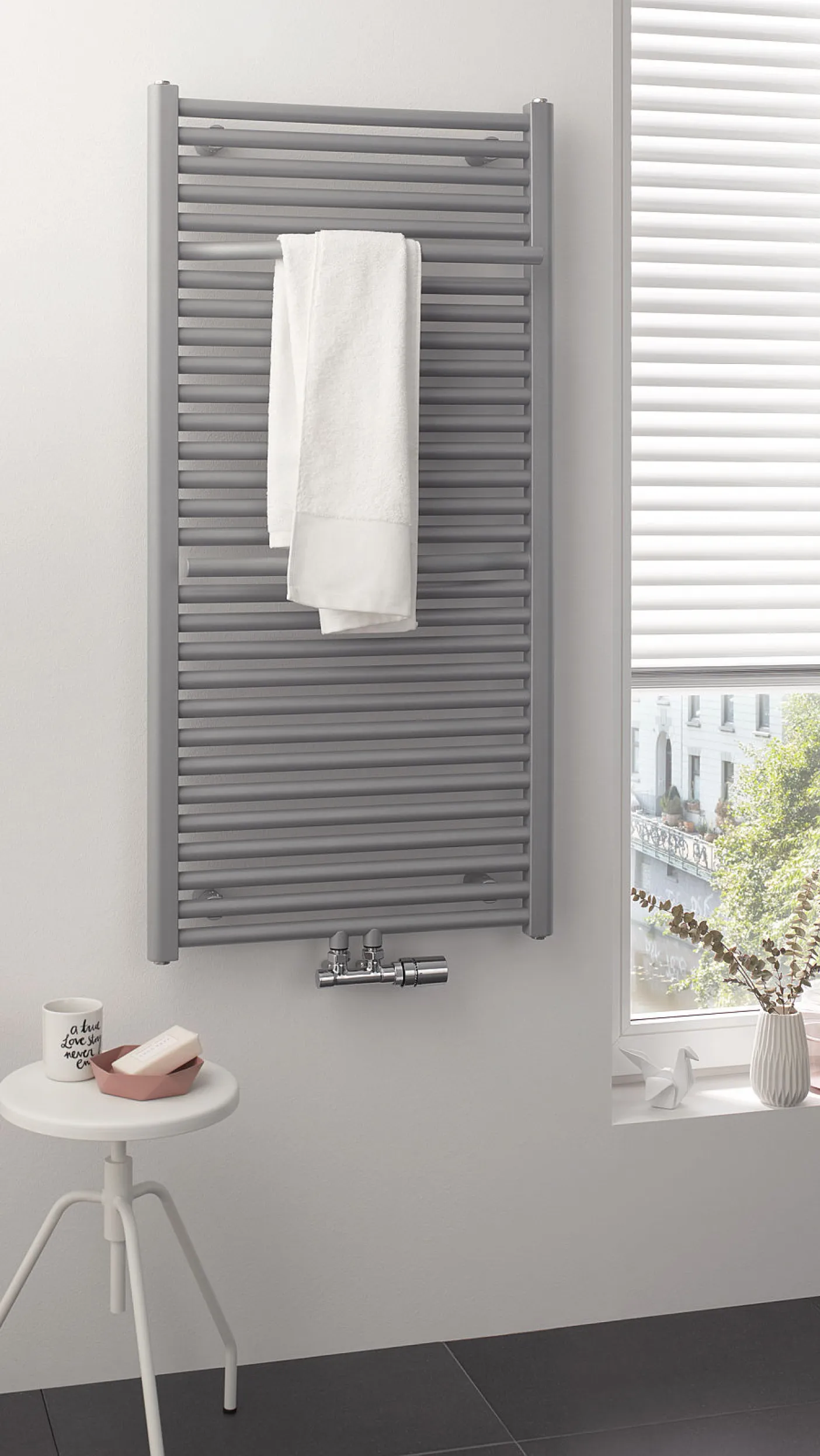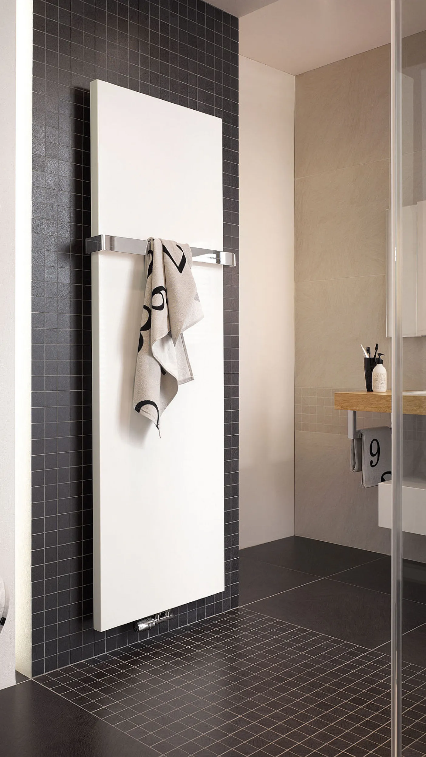 Ein besonderes Detail: Der Linie Plus verfügt über vereinzelt vorstehende Heizsprossen, auf die sich Handtücher zum Vorwärmen seitlich aufschieben lassen. Dadurch wird der Heizkörper nicht verdeckt und kann bei gleicher Heizleistung Badezimmer und Handtücher aufwärmen.
