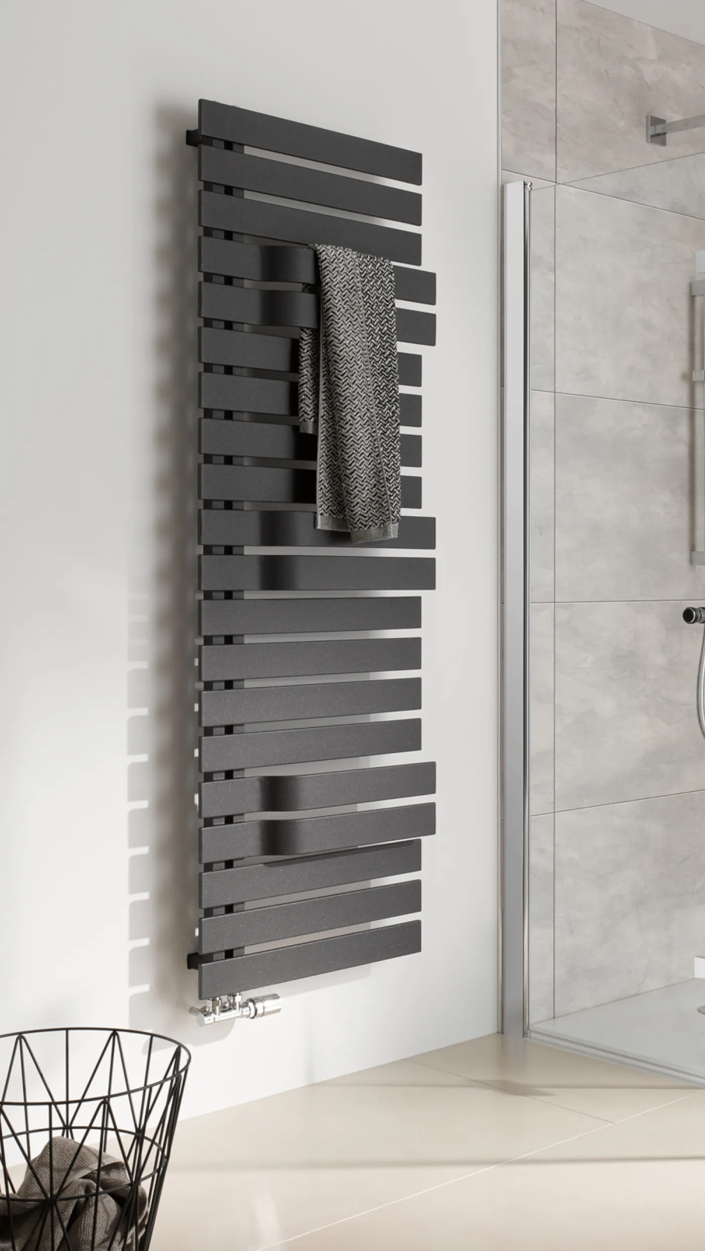Die moderne Formgebung und die hochwertigen Handtuchhalter schaffen funktionalen Platz für das Trocknen und Anwärmen von Handtüchern.