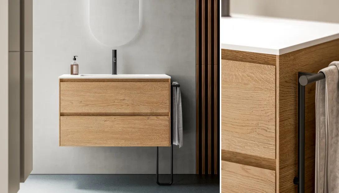Freischwebender Waschtisch mit heller Holzfront, weißer Keramikplatte und schwarzer Armatur in modernem Badezimmerdesign von Stocco.