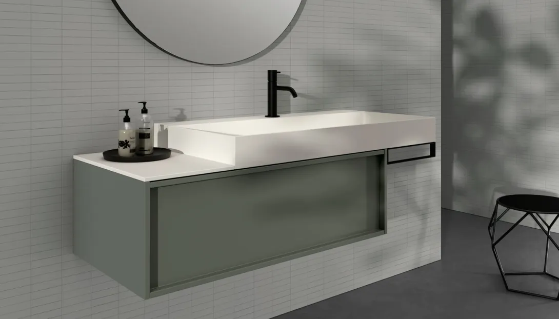 Verdeckte Griffe, ergonomische Details und hochwertige, feuchtraumgeeignete Materialien verleihen Loop seine besondere Substanz.