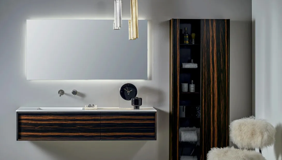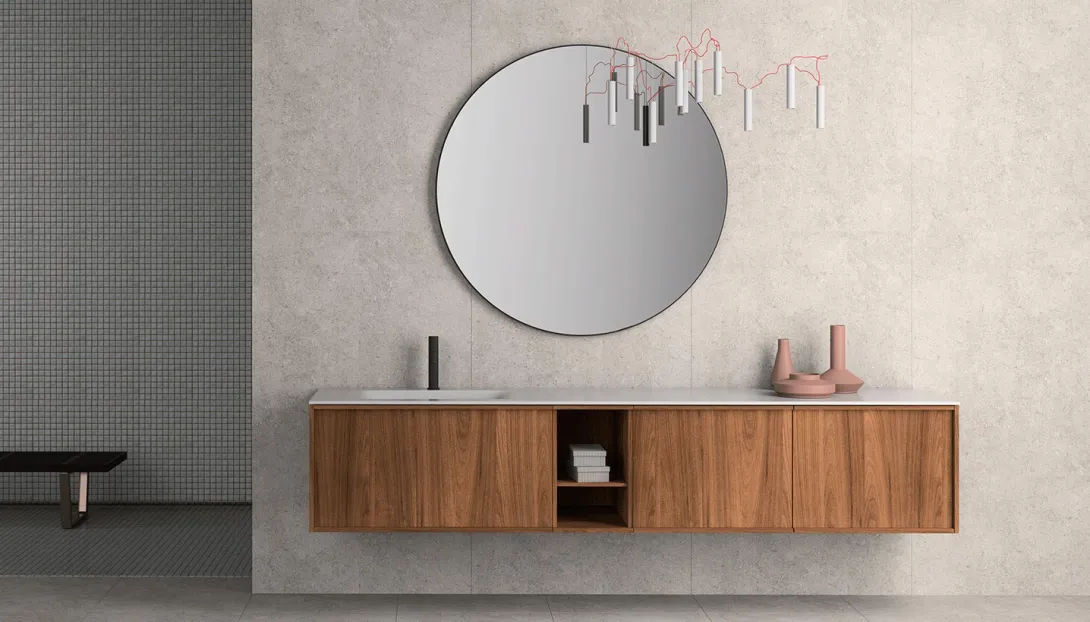 Langer, freischwebender Waschtisch aus dunklem Holz mit rundem Spiegel und minimalistischer Armatur in modernem Badezimmer von Stocco.