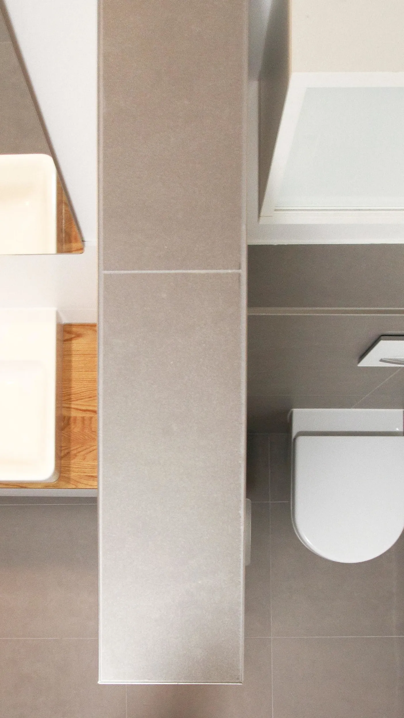 Viel Funktion und Komfort auf ein gerade mal 10 qm großes Badezimmer zu bringen, das von einer fünfköpfigen Familie benutzt werden würde, war eine Herausforderung. Für mehr Stauraum wurde vor dem Installationsschacht ein Einbauschrank mit Schiebetüren maßgefertigt, eine Trennwand mit Regalnischen erstellt, eine bodenebene Dusche realisiert und eine neue Lüftung mit Feuchtigkeitsautomatik sowie ein WC mit Geruchsabsaugung in dem innen liegenden Bad eingebaut. Dadurch entstand ein hoch funktionales Badezimmer auf engstem Raum, das da es mit zahlreichen Möglichkeiten ausgestattet ist, von einigen Familienmitgliedern zugleich benutzt werden kann und dadurch deutlich größer wirkt, als es eigentlich ist.